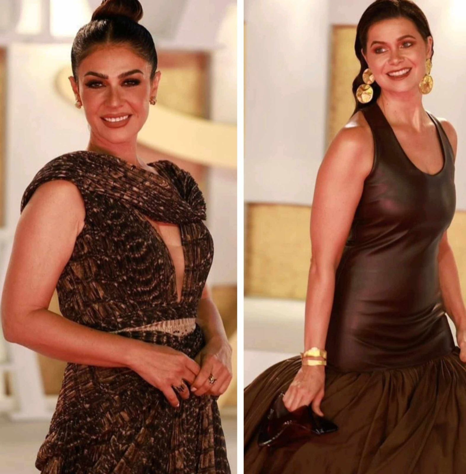 ورغم اختلاف تصميم الفستانين، إلا أن اللون الموحد جمع بين النجمتيْن، إذ اختارت يسرا اللوزي فستانًا طويلًا من الستان بلون النحاسي المائل للبني، بينما تألقت بسمة بفستان مطرّز بنفس الدرجات المعدنية الهادئة، ليشكلا معًا ثنائيًا أنيقًا في المنافسة على لقب أجمل إطلالة بلون الخريف.